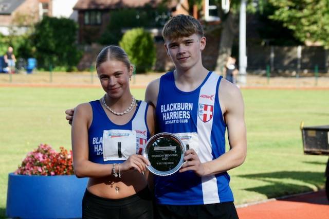 On Sunday August 31st, the final macth in this years West Premier Division of the Northern League took place. Blackburn Harriers went into the fixture after already winning the first three matches and secured the tille after placing 3rd on the day to finish with a ocmbined total of 22 League Point out of a possible 24. The Match was stopped just prior to the 4 x 400m Relays as Blackburn Harriers athletes Agatha Taylor and Logan McCredie were presented with the trophy by David Brown after a nice introduction by Trafford’s Mike Harris.