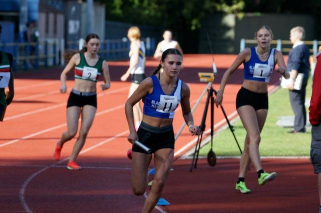 Lottie Smith (11) takes over from Agatha Taylor in 4 x 400m