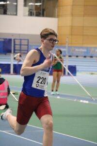 Day 2 started off for the Harriers with the 200m which saw U17 Niamh Boland – who like many of the athletes competing for Blackburn, were in their first competition of the season – posting a time of 28.69 in Heat 1 (3rd). U17 Jack Thompson placed 5th in Heat 2 running 25.95 whilst in Heat 3 U17 Louis George Drake ran a new PB of 26.89 in 4th spot. U17 Keir Michie clocked 24.09 3rd in Heat 5 as U20 Claudia Longton placed 5th in Heat 2 of the 200m in a time of 28.29. U20 Jacob Fisher clocked 23.81 (3rd) in Heat 2 followed in Heat 6 by U20 Men Charlie Palich and Daniel Nuttall – Charlie winning the Heat in a new PB time of 22.48 to go forward to the Semi-Final whilst Daniel placed 4th in a time of 24.28. Tamzin Osborne took the Bronze Medal for the U20 Women’s Pole Vault, clearing 2.90m in 3rd place, anad again, just her second competition of the season. Our second medal of the wekend came in the Senior Men’s 3000m where Joe Monk was in a race with Mark Bostock and Euan Brown – Joe came out of it with a Bronze medal in 3rd place clocking 8.38.28 and afterwards, told the Club that he was “Very pleased with the race and to medal which was the main aim. It was a very slow first 2km, running 5:57. From there the pace picked up a lot and I managed to come through strong for a 2:41 final km. That turn of pace is something I’ve struggled with previously but the final reps we do to work on pace at the end of sessions is helping a lot. Excited for the year ahead“. Charlie Palich set himself another new PB of 22.35 in the U20 Mens 200m Semi-Final – his third new personal best of the weekend – in qualifying for the Final where he ran 22.77 in 5th place – capping off a fine wekend for him.