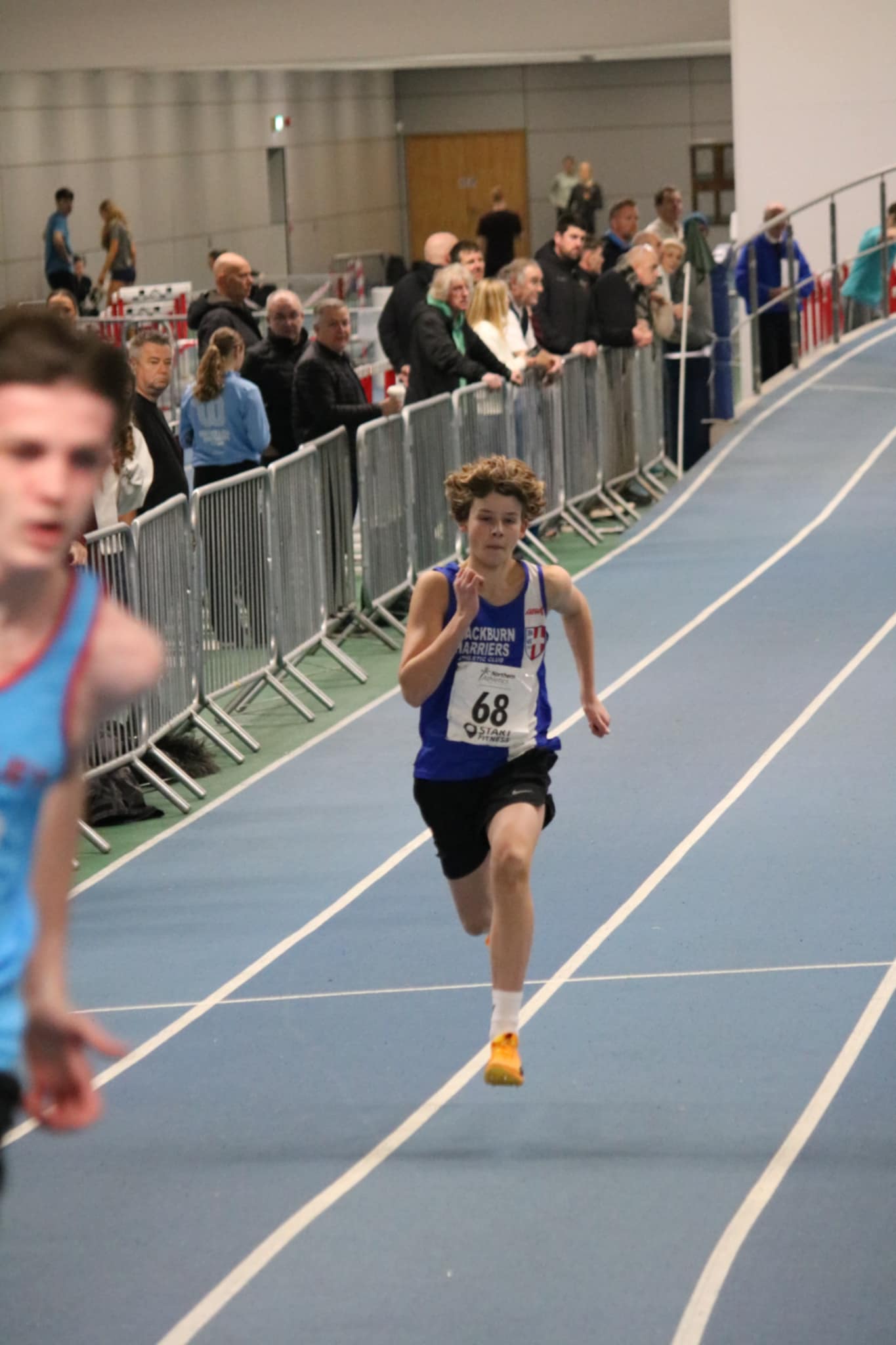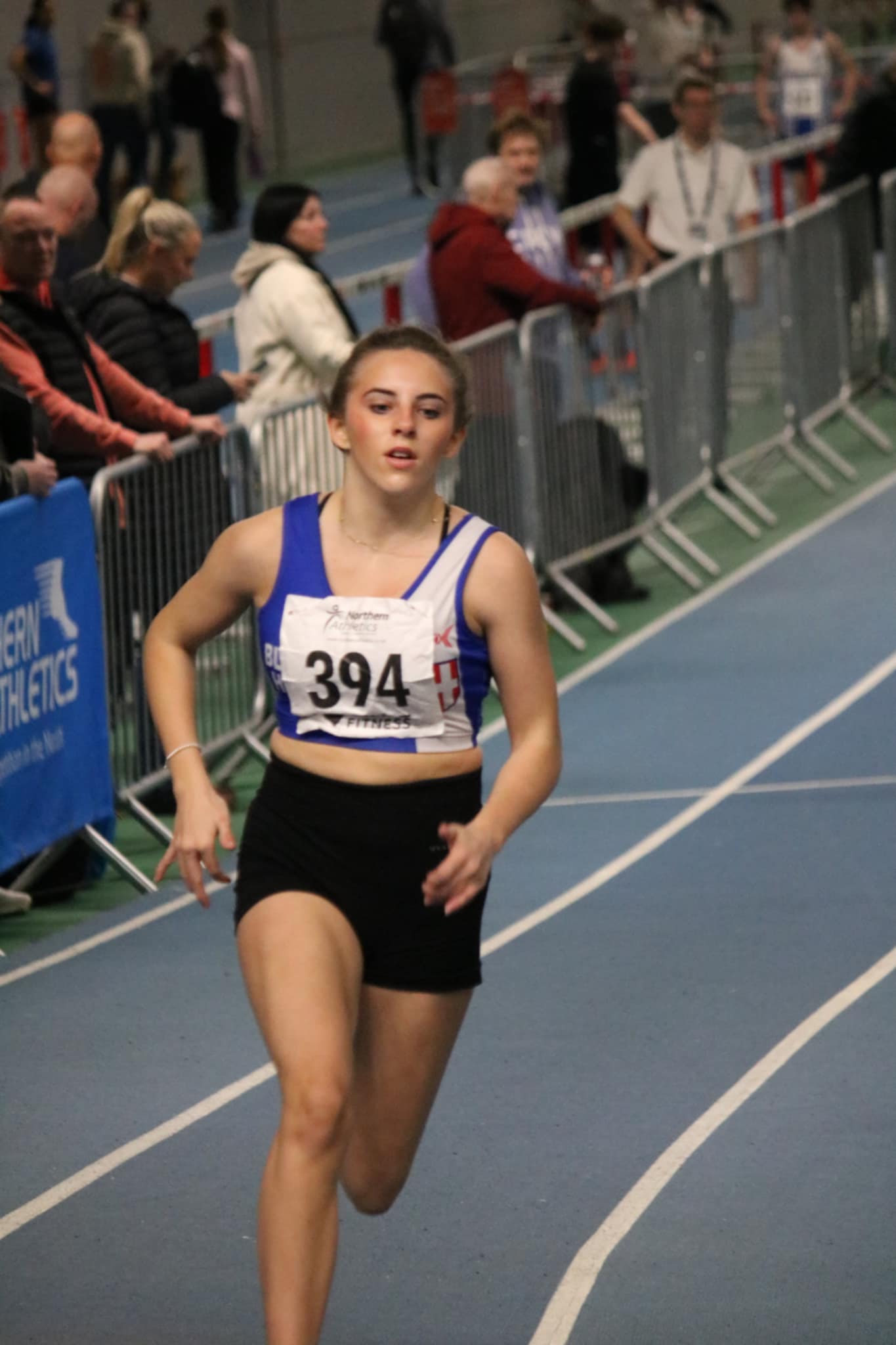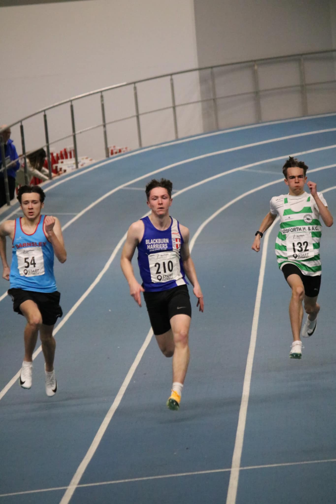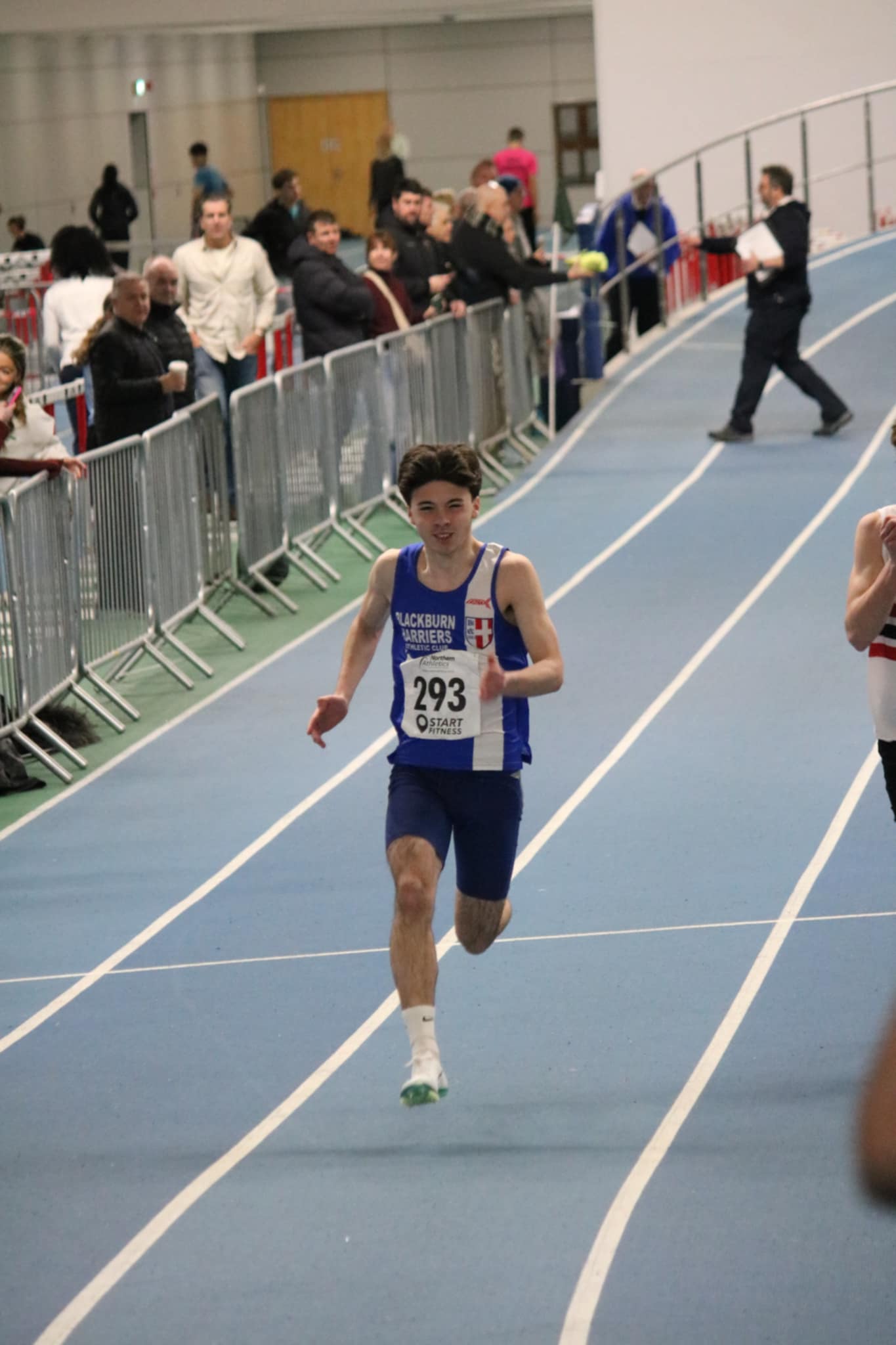 On the same weekend, the Northern Indoor T&F Championships for U17 & U20 athletes was taking place over the weekend at the EIS in Sheffield. (RESULTS). The 60m event is usually the most populated and it proved th be the case again. In the U17’s Niam Boland clocked 8.54 in 5th place to qualify for the Semi-Final where she ran a seasons best time of 8.50 in 8th. U17 Tomi Birch qualified from Heat 2 in 7.57 (3rd) and in the Semi-Final ran 7.60 in 6th spot. Keir Michie ran 7.55 in Heat 6 (3rd) alongside team mate Jack Thompson clocking 8.20 in 6th in the same Heat. Keir qualified for the Semi-Final placing 6th in 7.57. U20 Charlie Palich had a good day qualifying from heat 2 in 2nd place running 7.15 and then, although missing out on the Final ran a new PB of 7.02 in 4th spot. U20 Daniel Nuttall clocked 7.43 in Heat 3 (4th) whilst Jacob Fisher clocked 7.45 in 5th place (Heat 5).George Whittaker went in the Senior Men’s 60m clocking 7.33 in 5th place (Heat 4).Moving up to the 400m and it was a fine but tiring day for U17 Matthew Sharples who ran three 400m races on the day – qualifying for the Semi-Final with 53.42 in winning Hear 4, clocking a seasons best 52.44 in 2nd polace in the Semi-Final and then clocking a new PB time of 51.03 in 4th spot in the Final. Oliver Jones was running his first race for Blackburn Harriers and kicked off his season with a new PB of 56.19, taking 4th place in Heat 1 of the U17 Men’s 400m. In the field events, U20 Claudia Longton placed 5th in the Triple Jump Final with a leap of 9.48m in her first competition of the season.