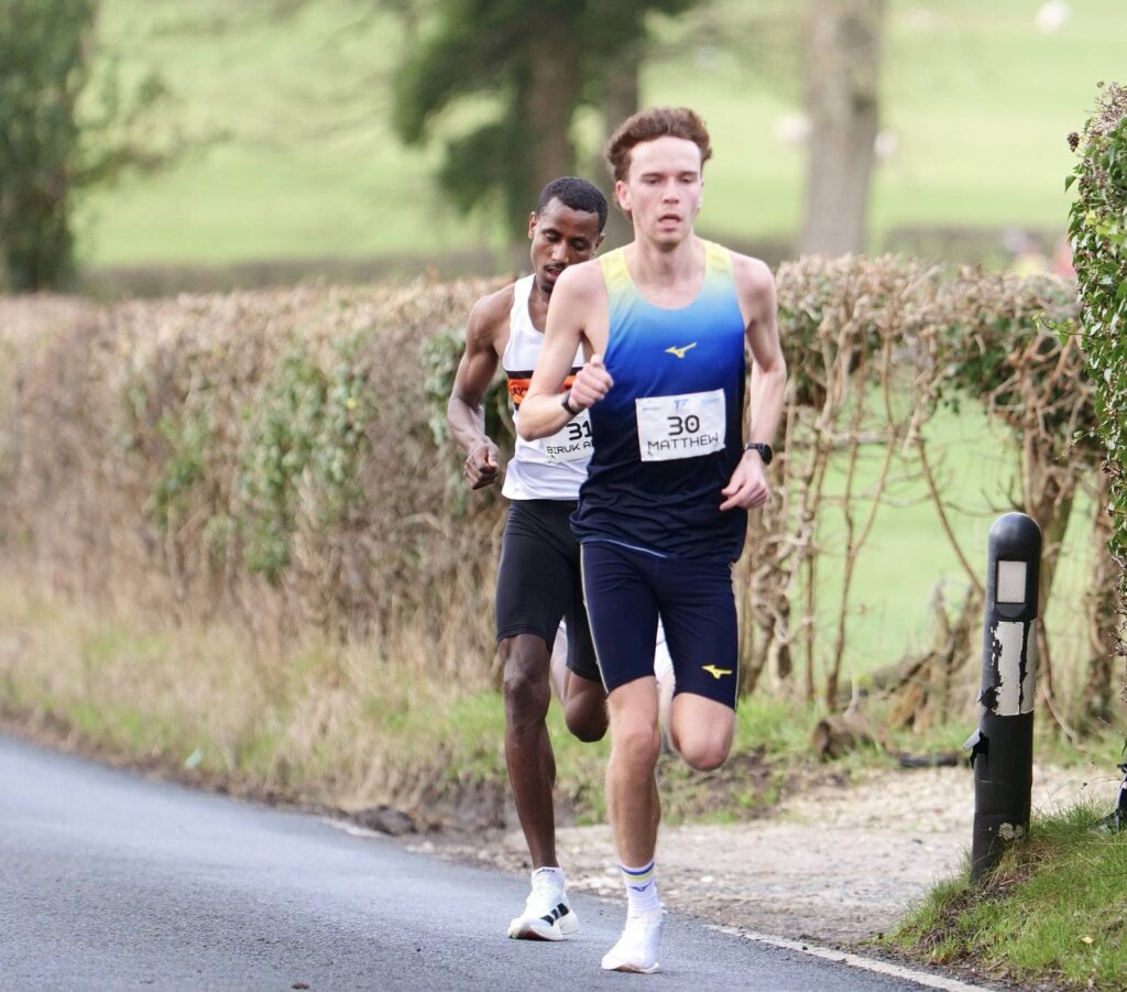 At the 5k mark three athletes had opened up a gap on the main pack – Ollie Lockley, Matt Ramsden and Biruk Kebede. Around the 8k mark, this became two fighting or first place – Matt and Biruk with Ollie in 3rd place and clear of the chasing group. Coming down the final hill, across the bridge and on to the hill finish, Matt surged again to take a most impressive win in a new PB time of 29.05 with Biruk in 2nd (29.12) and Ollie in 3rd (29.30). The first seven athletes all finished in sub 30 minutes followed by another group of 11 running sub 30.30. Matt’s run of 29.05 was not only a new personal best but also broke the Club Record which had only been set again a few weeks ago by Rob Warner-Judd when he ran 29.16 at Leeds Abbey Dash. Winning the race meant that Matt also took the Gold Medal in the Northern Athletics 10k Road Race to top off what has been a great year, even if it is one truncated by injuries at times. 2025 has seen Matt post new personal bests for 1500 (3.46.23); Mile (4.08.10); 5k (13.44); 10000m (29.16.07); 10k (29.05). In addition he has won the U23 Cross Country European Trial at Sefton Park, earning him automatic selction for the GB U23 Cross Country Team in Portugal where he placed 6th and first GB counter. Alongside all of this, Matt has now been selected for the GB Senior men’s Team to race the World Cross Country Championsips in Tallahassee on January 10th 2026. We spoke to Matt after he won the Ribble Valley 10k – only the second Blackburn Harrier ever to have won it – and he gave us his thoughts at this time, commenting “I love doing the Ribble Valley 10k each year and this year was my best! It’s a challenging course but it attracts some great runners and is a credit to all those who help organise it. The aim for me was to get a good run out over a 10k distance ahead of the World Cross in 13 days time and I’m glad to have done that today. Happy with the win, a pb and a club record to top it off! Well done to all the Harriers that ran!” (Matt Video)